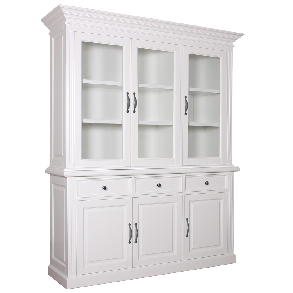 Sierlijke buffetkast, voorzien van engelse koof wat zorgt voor de landelijke uitstraling. De kast is voorzien van 6 openslaande deuren en 3 laden.