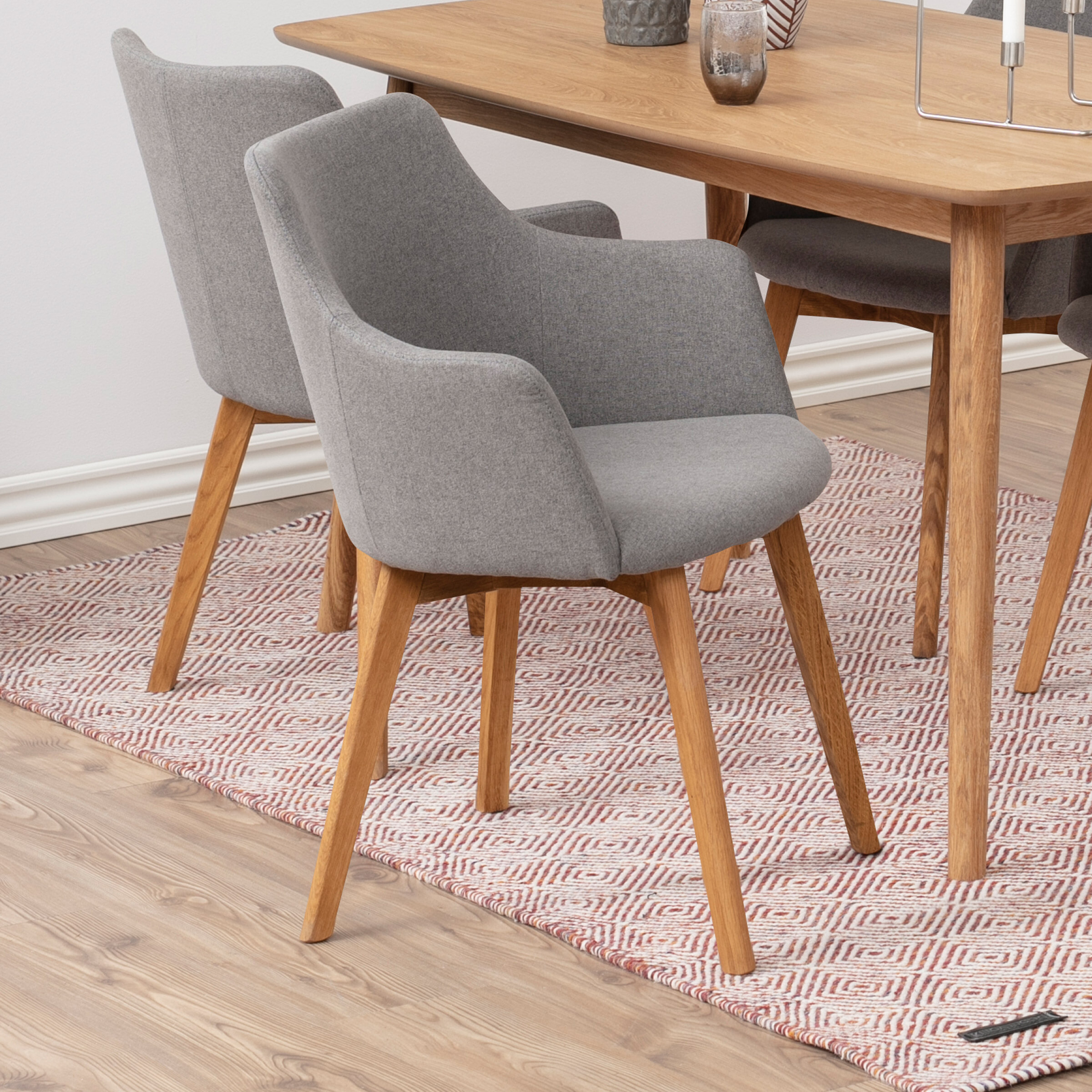 Een eigentijdse zitoplossing met groot contrast tussen met olie behandeld eiken onderstel en stof. De eetkamerstoel heeft een comfortabele zitting met verzonken armleuning en zal een moderne en stijlvolle toevoeging zijn aan elk huis.