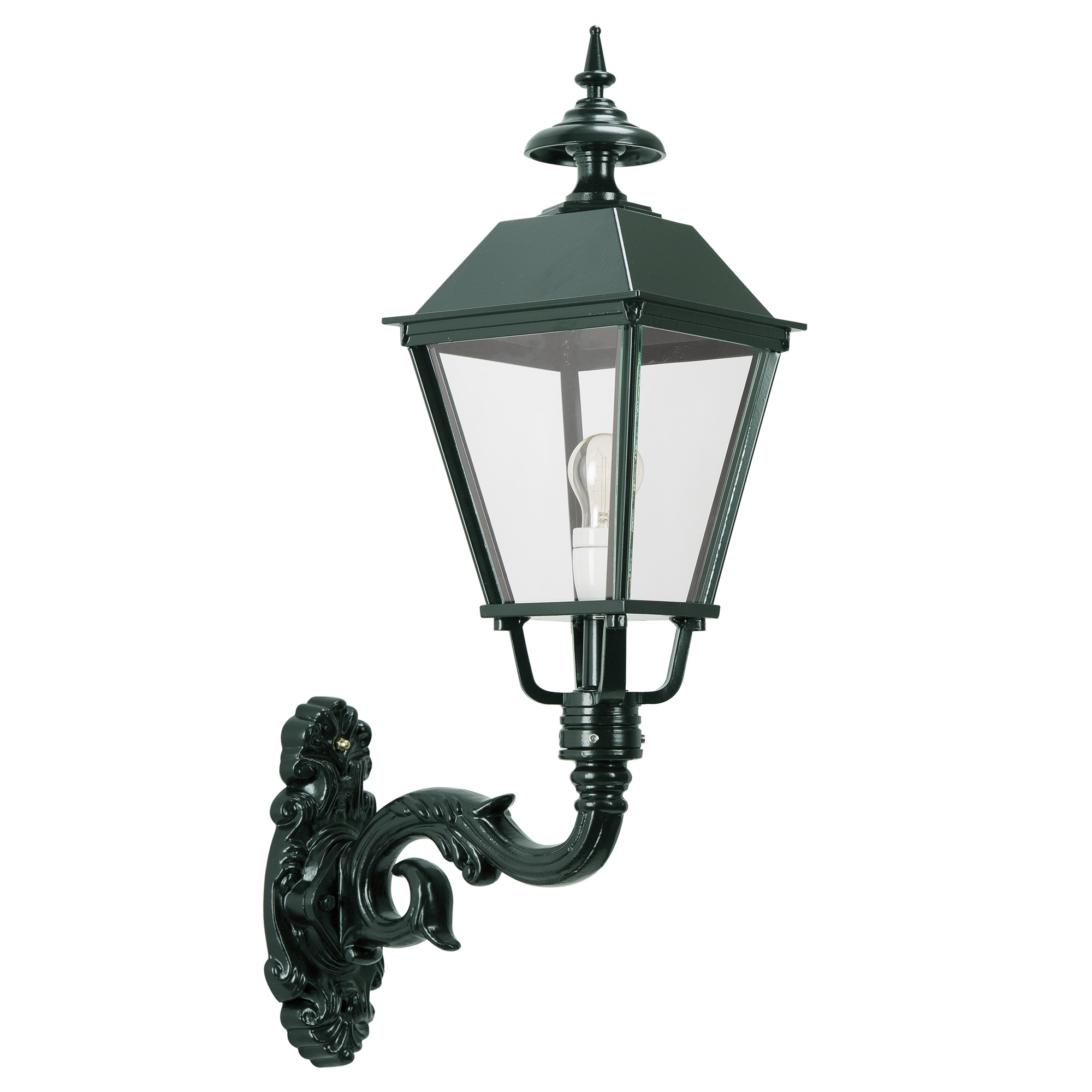 De Essen L is een klassieke buitenlamp in grachtengroen of een van de prachtige andere kleurmogelijkheden. In Nederland zie je in veel steden en dorpen nog de klassieke nostalgische buitenverlichting. De prachtige lantaarnpalen en buitenlampen zijn echt sfeerbepalend in het straatbeeld. Bij Nostalux kun je kiezen uit een zeer breed assortiment klassiek Oudhollandse verlichtingsarmaturen. Dit model, de Essen L, is een echte klassieker. De steun (Volendam) is een prachtige nostalgisch klassieke muursteun. De steun heeft een decoratieve achterplaat. De steun is 34 cm hoog en komt 32 cm uit de muur. De vierkante kap (K6C) welke naar beneden gericht is gemonteerd heeft een hoogte van 60 cm en is 25 cm breed. Er is een E27 porseleinen fitting toegepast waardoor er diverse lichtbronnen gebruikt kunnen worden. Zowel spaar, halogeen als LED lichtbronnen. Wij adviseren om een Classic of Rustic LED bol toe te passen, deze geven een zeer mooi warm geel licht, zoals je van de ouderwetse gloeilampen gewend bent, maar dan zijn ze energiezuinig, duurzaam en hebben bovendien een lange levensduur.De Essen L is van het merk KS Verlichting. KS levert exclusieve handgemaakte kwaliteitsproducten vervaardigd van duurzame materialen met een uitstekende prijs-kwaliteitsverhouding. Prachtige kwaliteit buitenverlichting welke niet alleen functioneel is maar karakter, stijl & sfeer geeft in jouw tuin en/of rondom jouw huis.Buitenverlichting om gezien te worden!