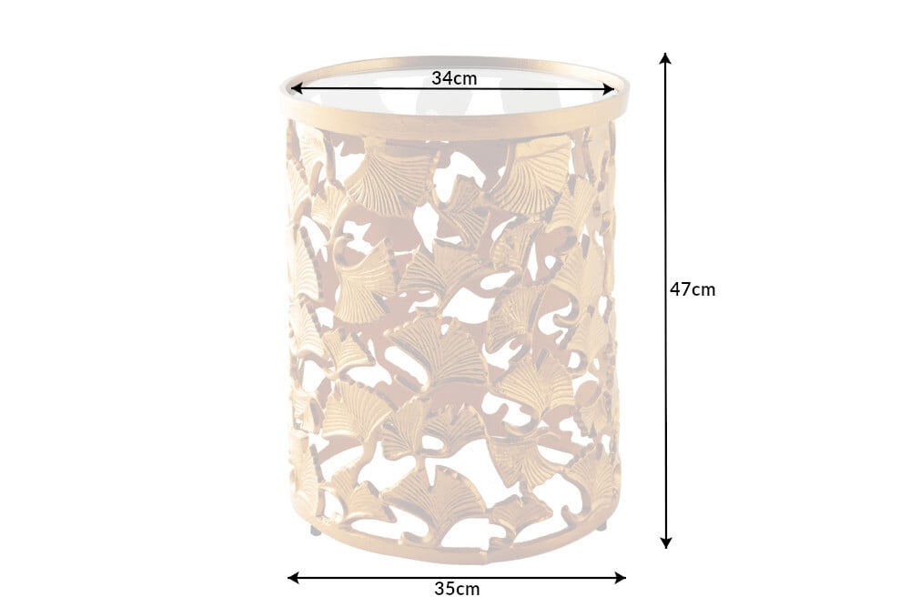 De GINKGO salontafel betovert op het eerste gezicht! Het cilindervormige tafelframe in goud bestaat uit vele kleine ginkgoblaadjes. De karakteristieke inkepingen en bladnerven onderstrepen perfect de authentieke uitstraling van de ginkgobladeren . Een ronde glasplaat biedt een mooie opbergruimte voor kaarsen, koffie of stijlvolle salontafelboeken.