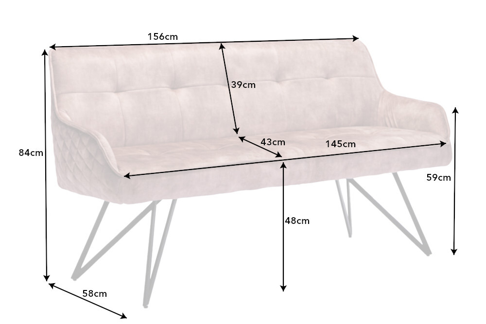 Design bank EUPHORIA 160cm champagne grijs fluweel haarspeldpoten metalen poten armleuningen – 43126
