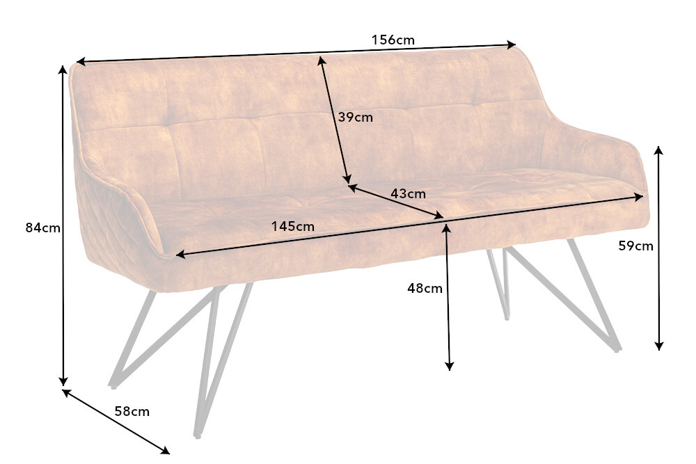 Design bank EUPHORIA 160cm mosterdgeel fluweel retrostijl decoratief quilten haarspeldpoten metalen poten armleuningen – 43128