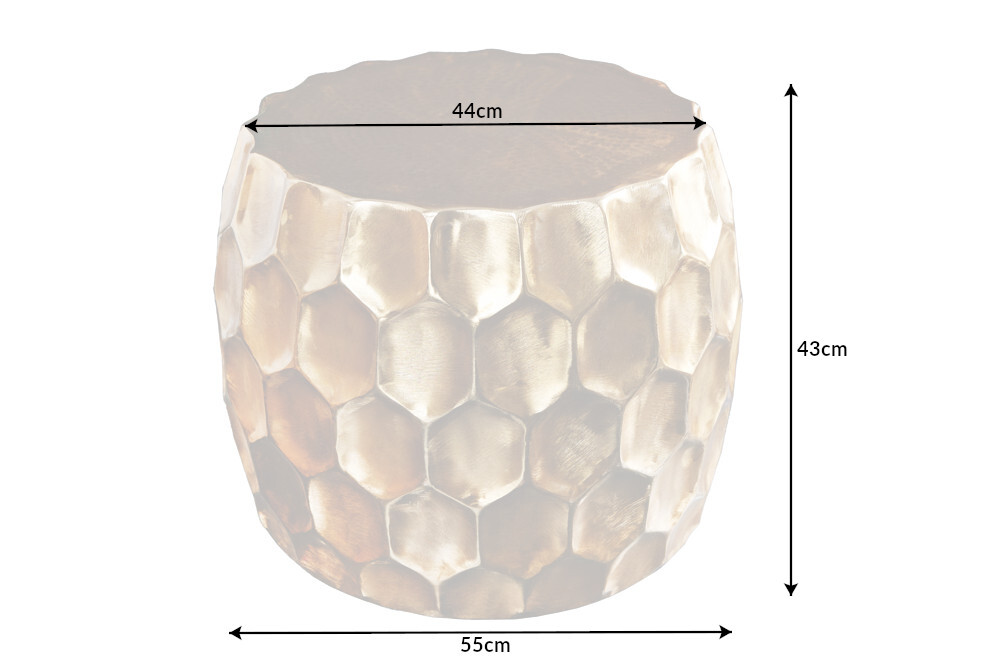 De ORGANIC ORIENT bijzettafel overtuigt door zijn elegante uitstraling en brengt glamoureuze flair in uw woonkamer. Een bijzonder hoogtepunt van de salontafel in goud is het driedimensionale honingraatdesign aan de buitenkant van de tafel en de gehamerde look op het tafelblad. Geef je huis een oosterse uitstraling met dit handgemaakte meubelstuk!