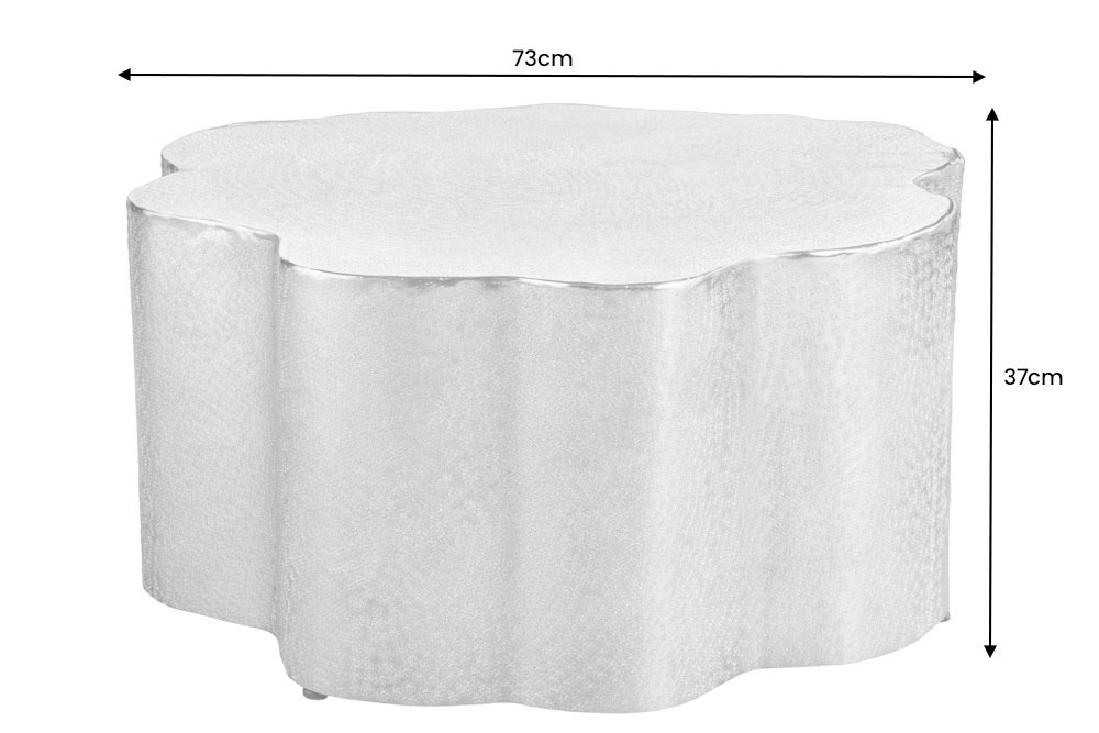 De organische vormen en het glanzende oppervlak van de salontafel zijn ontworpen in artistieke patronen en maken indruk met hun oneffen oppervlakken en individuele lijnen. Dit betekent dat het zilveren oppervlak afhankelijk van de lichtinval altijd met een andere glans glinstert. Ondanks het extravagante design kun je de salontafel op vele manieren combineren en geef je woonruimte een vleugje oosterse flair!