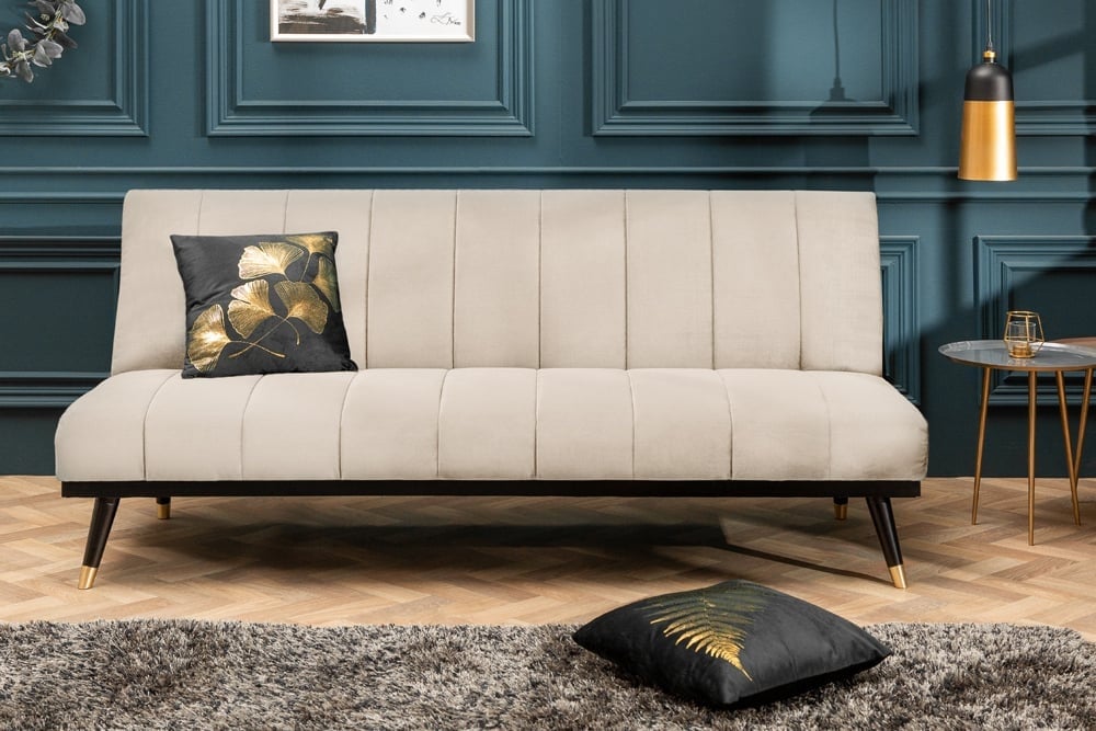 Haal een echt design-highlight in huis met onze extravagante slaapbank! De fluweelzachte hoes in tijdloze champagne trekt ieders aandacht en verwent je met een aangenaam gevoel. De verticale siernaden geven de 3-zitsbank een bijzondere elegantie, terwijl de zwart metalen poten met gouden applicaties zorgen voor een vleugje moderne retro chic.
