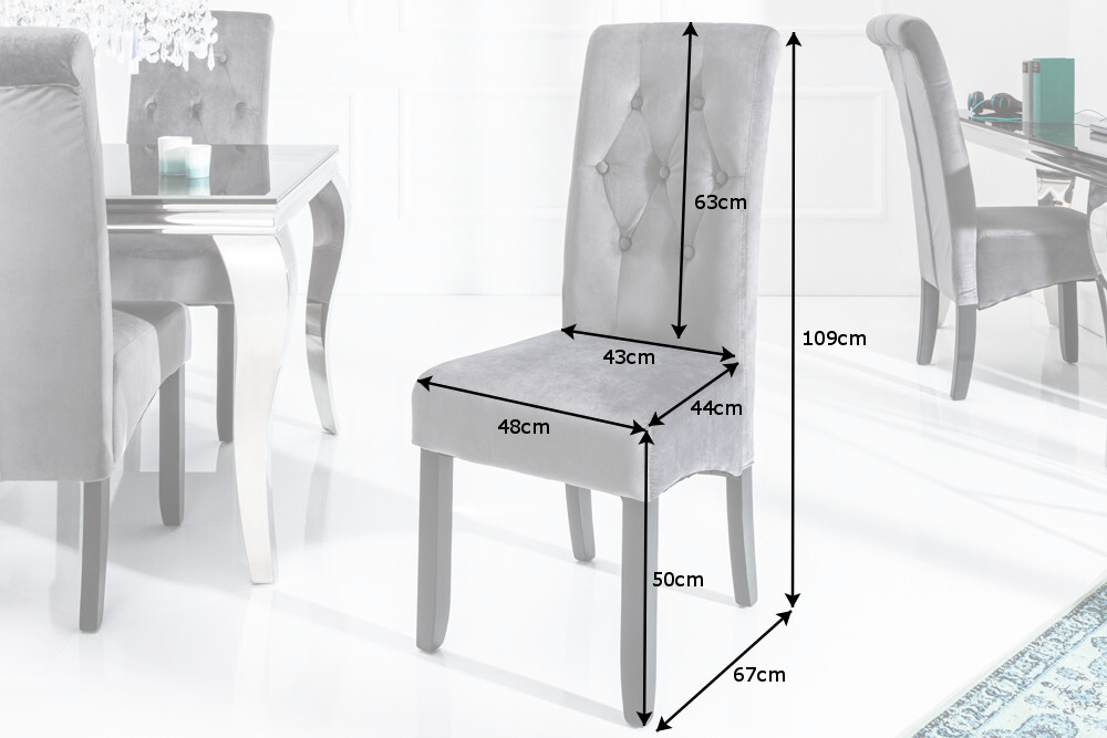 De stoel is bekleed met hoogwaardig grijs fluweel, wat hem een aantrekkelijke koloniale uitstraling geeft. Bijzonder opvallend zijn de uitvoerig geplaatste knoppen, die doen denken aan het populaire en elegante Chesterfield-design. De comfortabele vulling zorgt voor een onovertroffen zitcomfort, wat nog eens wordt ondersteund door de prachtige nekrol. De zwarte massief houten poten zorgen voor een stabiele stand.Deze tijdloze designstoel is een absolute musthave voor jouw woonomgeving.