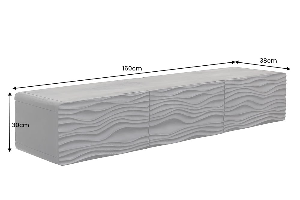 Met het zwarte tv-meubel van massief mangohout haal je een stijlvol en functioneel meubelstuk in huis. Het hoogtepunt van deze kast is zonder twijfel de driedimensionale oppervlaktestructuur van de fronten. De deuren in golfachtig design zijn een echte eyecatcher in je huis en combineren maritieme details met tijdloos design. Het houten oppervlak is uitvoerig met de hand vervaardigd. Dankzij de hangende constructie zweeft het tv-bord letterlijk aan de muur, waardoor een luchtige en stijlvolle sfeer ontstaat.