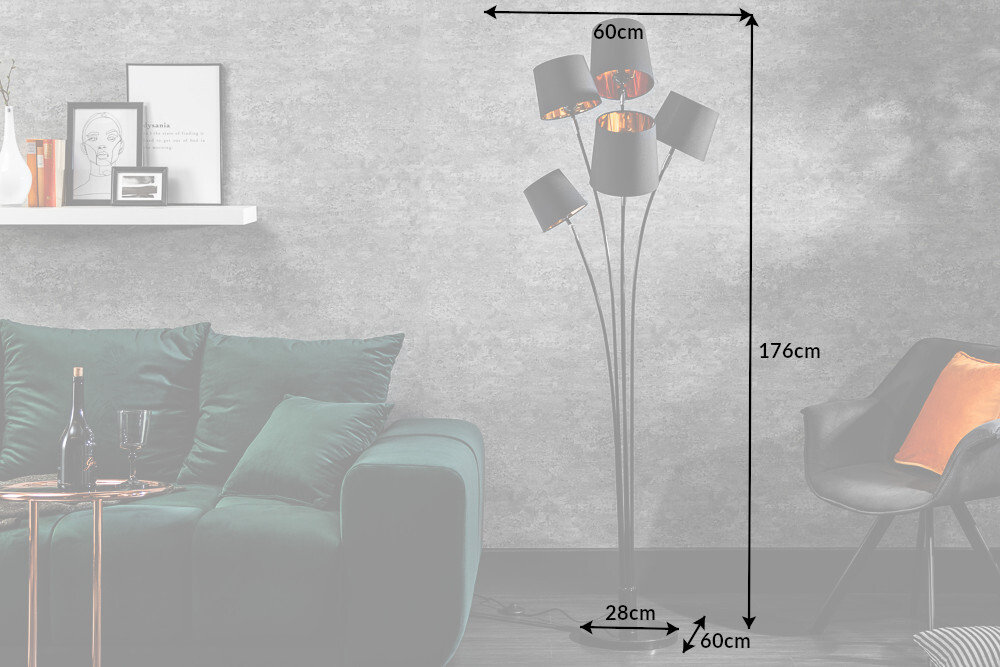 Deze elegante vloerlamp overtuigt door een fantasierijk design in charmant retro-design. Vijf klassieke tinten met een gouden binnenkant geven de moderne vloerlamp een bijzonder lichteffect. Het delicate frame met draaibare elementen zorgt ervoor dat de lamp een bijzondere uitstraling heeft. Dit betekent dat de lampenkappen zich op verschillende hoogtes bevinden en een unieke lichtsfeer creëren.