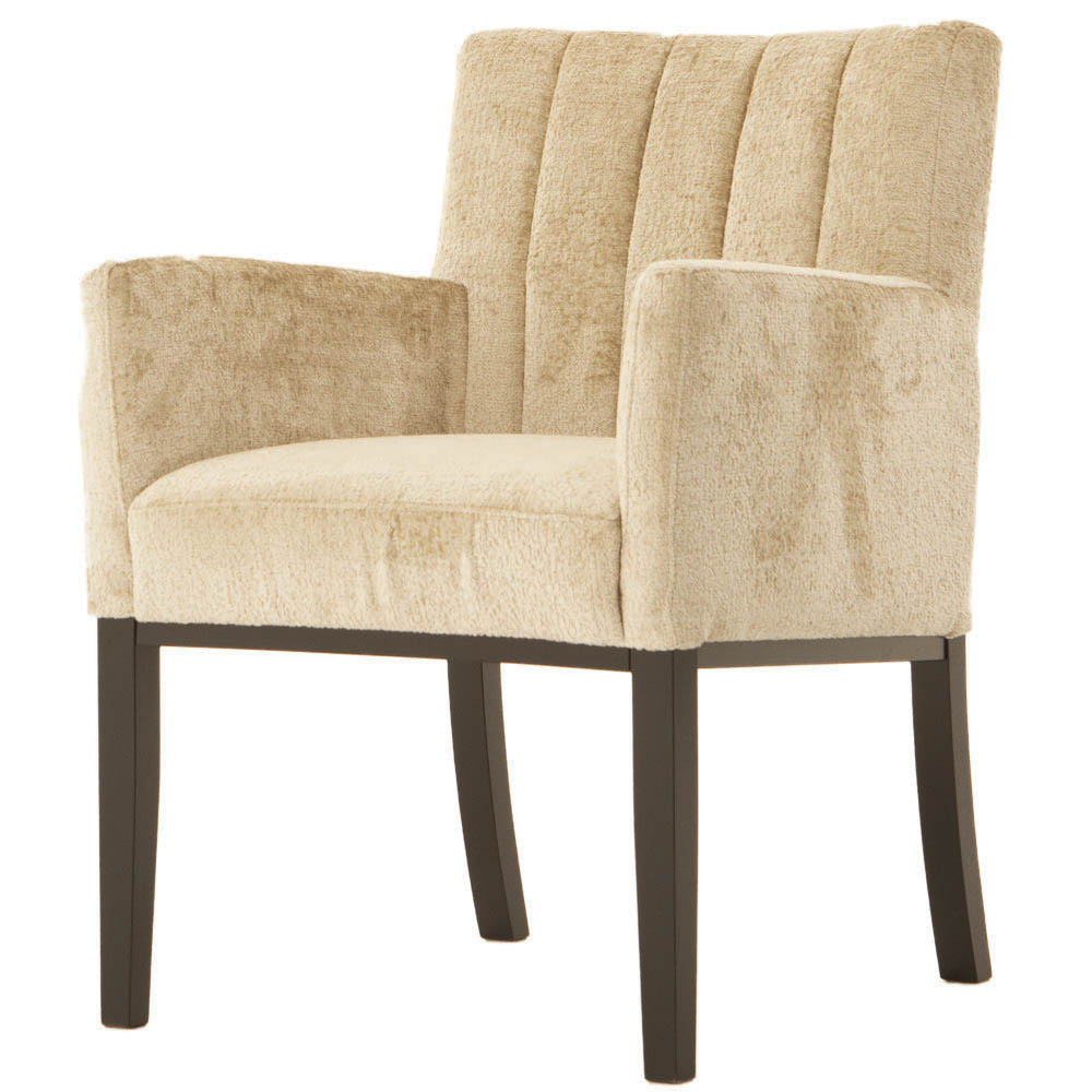 De stoel kenmerkt zich door het houten onderstoel en de gestepte rugleuning.U heeft de keuze uit een grote collectie stoffen.