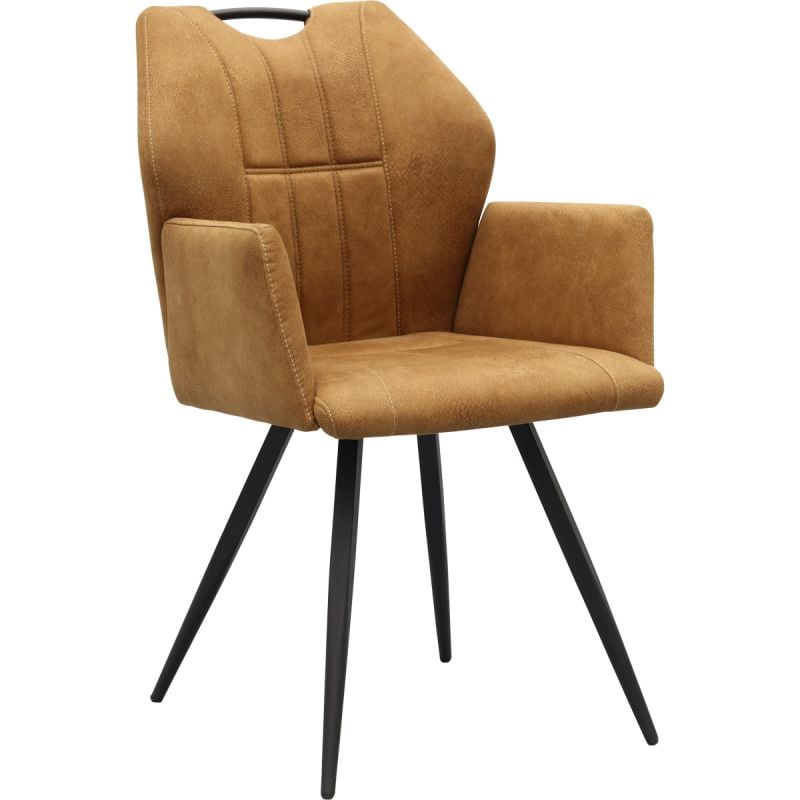 Voor wie van een comfortabele eetkamerstoel houdt, zit goed met stoel Porto. Eetkamerstoel Porto heeft namelijk een fijne zitting gevuld met ondersteunend schuim en heeft praktische armleuningen. De stoel is cognac van kleur, is bekleed met stof Zorro en heeft stoere poten van zwart metaal. Wil je toch iets anders? Porto is ook verkrijgbaar in moss en taupe. Voor ieder wat wils! Tip: combineer de diverse tinten met elkaar voor een speelse uitstraling.