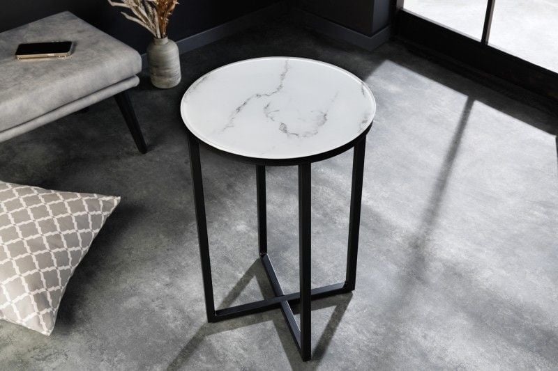 Elegante bijzettafel BOUTIQUE 40cm wit rond kristalglas met marmeren decor zwart frame – 42162