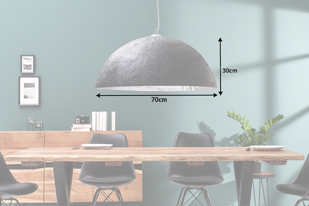 Geef je eettafel of woonkamer een bijzonder warme en gezellige sfeer: met de design hanglamp GLOW. Door de zwarte buitenkant van het lamplichaam oogt de lamp tijdloos en stijlvol elegant in veel verschillende interieurstijlen. De grote kap van deze prachtige lamp is halfrond en gemaakt van glasvezel en glasvezelmateriaal en straalt indirect een stralend licht de kamer in door de zilveren reflector aan de binnenkant.