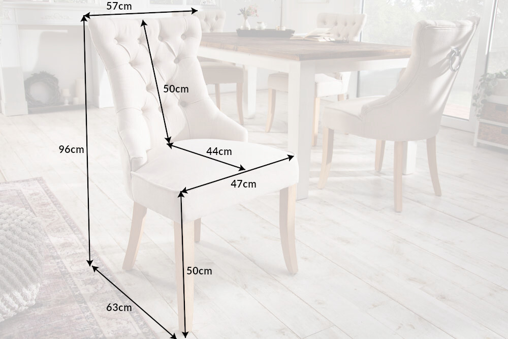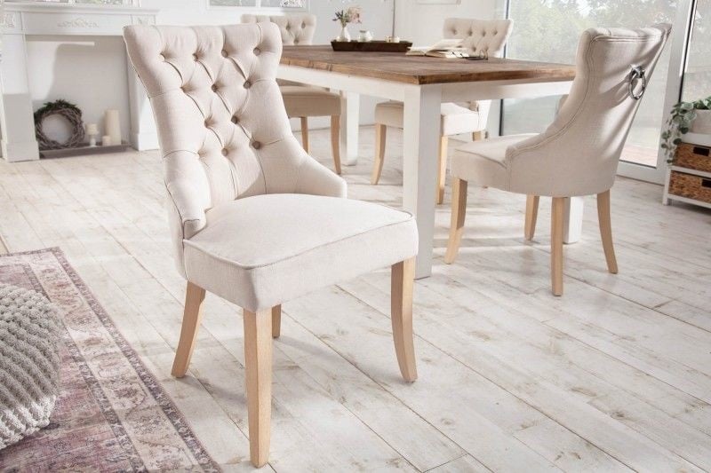 Neem plaats en verheug je op een nieuwe favoriete plek aan de eettafel! Onze comfortabele stoelen uit de CASTLE serie combineren maximaal zitcomfort met een elegant, gezellig design dankzij de Nosag vering. De hoge rugleuning en de vulling zorgen voor het beste comfort en bovendien is hij voorzien van prachtige sierknopen die doen denken aan het wereldberoemde Chesterfield-design. Het beige bekledingsmateriaal en de houten poten geven de stoel daarentegen zijn charmante landelijke uitstraling.