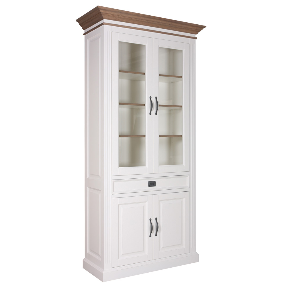Landelijke vitrinekast uitgevoerd met 4 openslaande deuren en een praktische opberglade.