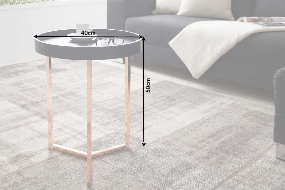 Ben je op zoek naar een bijzettafel met meerdere functies en heb je vaak een dienblad nodig om te serveren? Dit kleine dienbladtafeltje met een diameter van 40 centimeter is een alleskunner. Hij staat decoratief voor de bank of in de eetkamer, waar hij opvalt door zijn matzwarte oppervlak. De opstaande rand is niet alleen handig bij het plaatsen van drankjes, maar ook bij gebruik als dienblad. Het driepotige frame van glanzend koper kan met een handbeweging van het oppervlak worden gescheiden, waardoor deze bijzettafel zonder veel moeite een handig dienblad wordt om gasten te ontvangen.