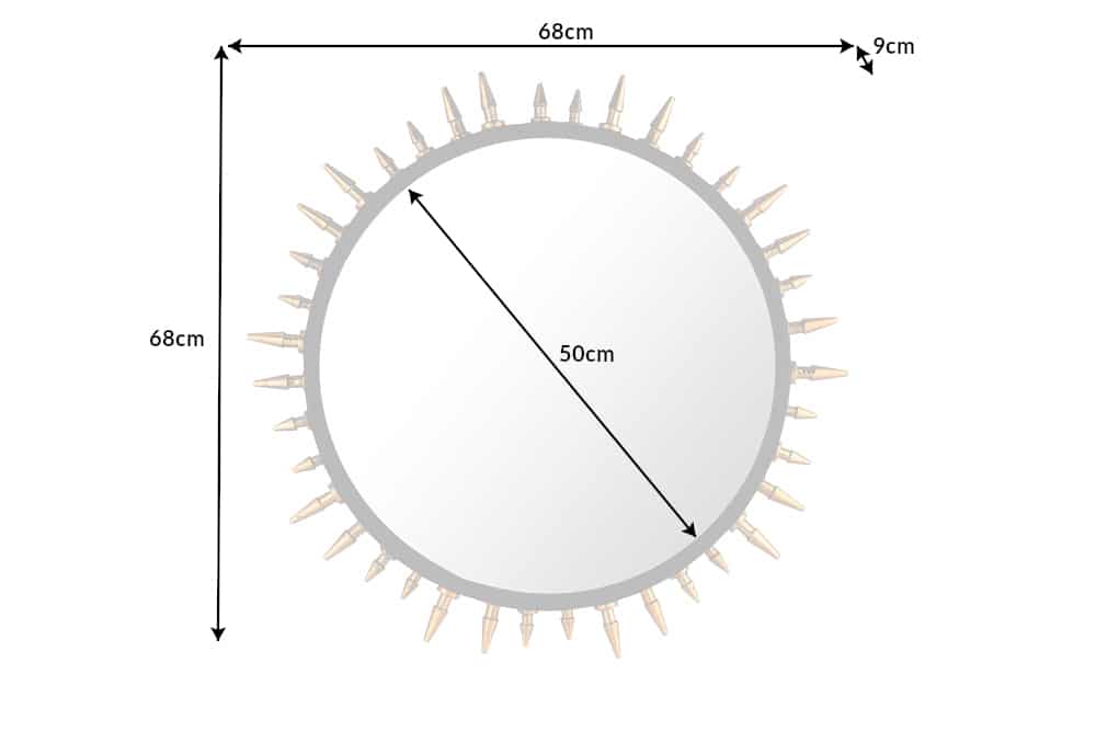 Als je een opvallend woonaccessoire aan de muur van je kamer wilt plaatsen, dan is onze ABSRACT wandspiegel precies wat je zoekt. De grote, ronde spiegel heeft een smal frame van zwart metaal. Het bijzondere eraan zijn de talrijke gouden klinknagels, die in verschillende maten in een stralende vorm aan de buitenrand zijn gerangschikt.