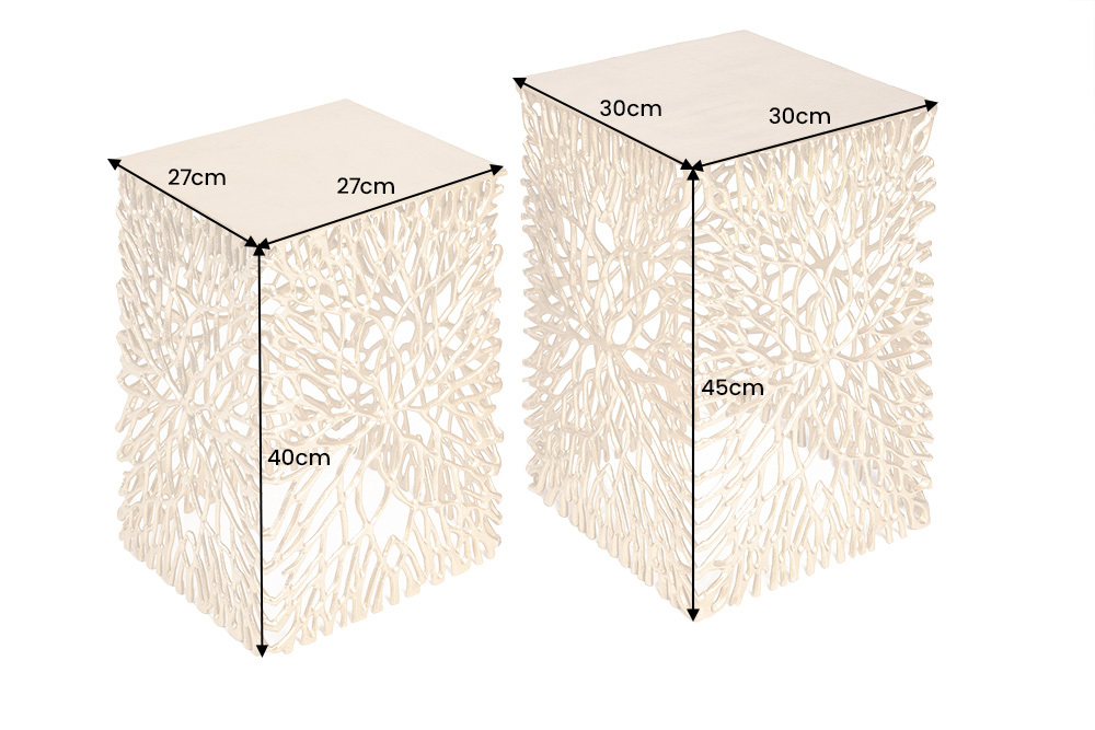 Dit sieraad zal een echte blikvanger zijn in uw sfeer. De bijzettafels in verschillende maten in een set van 2 bestaan volledig uit een oppervlak dat doet denken aan de fijne structuur van een blad. De talloze fijne takken creëren een lichaam dat dankzij de vele uitsparingen licht en delicaat oogt. Elke bijzettafel wordt met de hand in elkaar gezet en is een prachtig uniek stuk dat een elegante flair en een vleugje extravagantie uitstraalt.