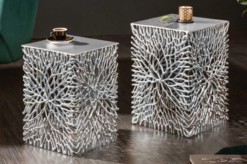 Dit sieraad zal een echte blikvanger zijn in uw sfeer. De bijzettafels in verschillende maten in een set van 2 bestaan volledig uit een oppervlak dat doet denken aan de fijne structuur van een blad. De talloze fijne takken creëren een lichaam dat dankzij de vele uitsparingen licht en delicaat oogt. Elke bijzettafel wordt met de hand in elkaar gezet en is een prachtig uniek stuk dat een elegante flair en een vleugje extravagantie uitstraalt.