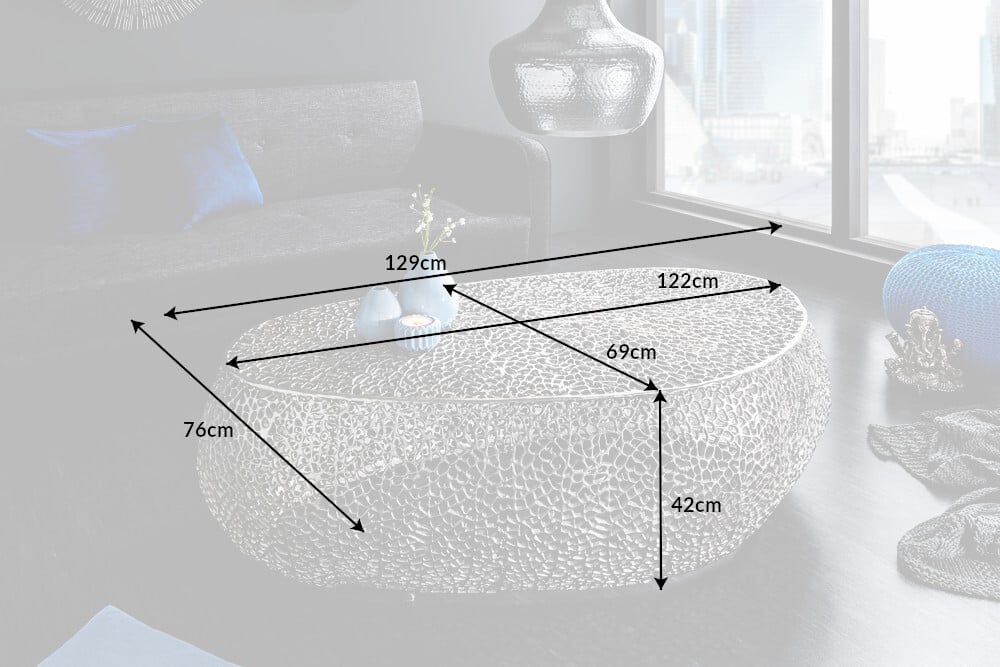 De asymmetrische vorm van de salontafel geeft hem een heel bijzondere uitstraling die het organische ontwerp van het oppervlak vakkundig oppikt en voortzet. Ondanks het glanzende zilveren oppervlak lijkt de tafel een door de natuur geïnspireerde uitstraling te hebben, waardoor hij een eyecatcher is in elke woonkamer. Het weelderige design van de tafel werkt op zichzelf, je hoeft hem niet te combineren met veel decoratie om een indrukwekkende woonervaring te creëren. Bovendien ben je geheel vrij in de keuze van de bank: een donkere bank past net zo goed bij de salontafel als een lichte woonruimte.