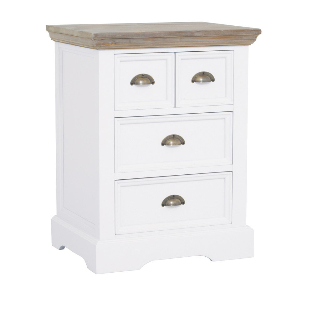 Het romantische en landelijke meubelprogramma Fleur bestaat uit diverse trendy, witte meubelen met vergrijsde houten bladen.De ladenkast is voorzien van 2 grote en 2 kleine opbergladen.Afmeting: 56x43x73 (h)cm Kleur: C027 White RAL 9010 – pine old greyBekijk ook de andere meubelen van het romantische programma Fleur.Levertijd: 2 – 4 weken