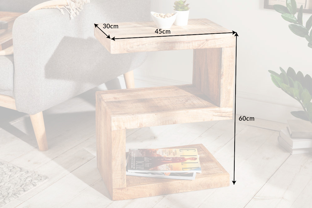 Bij deze bijzettafel ontmoet mooie, natuurlijke flair een spannend design. De bijzettafel van massief mangohout is ontworpen in een S-vorm en biedt daarom drie planken waarop je decoraties, boeken of woonkamerspullen kunt plaatsen. Daarnaast is de tafel zowel staand als liggend te gebruiken, waardoor deze eenvoudig aan te passen is aan jouw smaak en de ruimte waarin de tafel geplaatst moet worden.