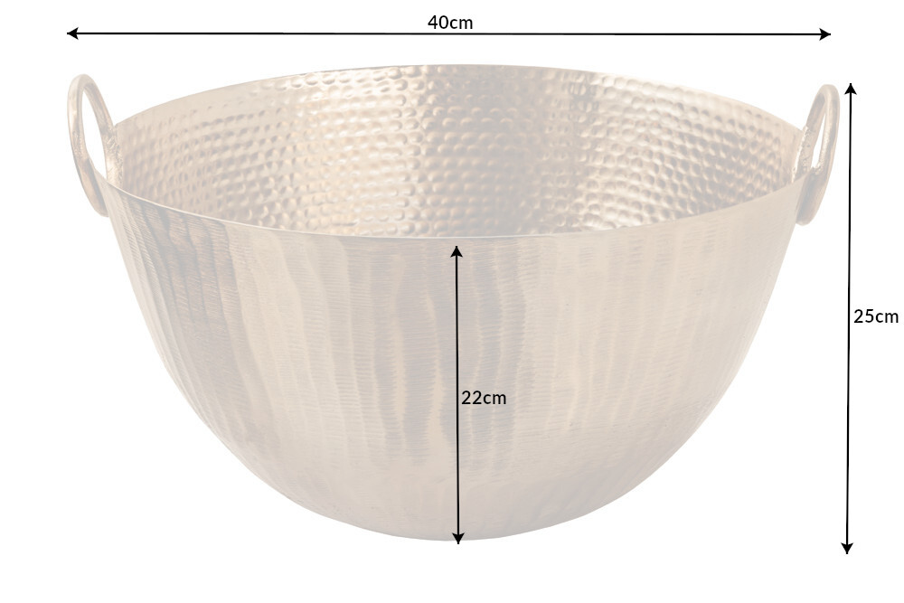 Een hoogtepunt voor alle decoratieliefhebbers: de ORIENT gehamerde schaal in goud kan prachtig in uw tafeldecoratie worden geïntegreerd en individueel worden gedecoreerd. Dankzij het formaat wordt het woonaccessoire de perfecte opbergmogelijkheid en is het een visueel hoogtepunt in je huis! De grote metalen schaal is ook perfect als fruitschaal of sleutelopberger.