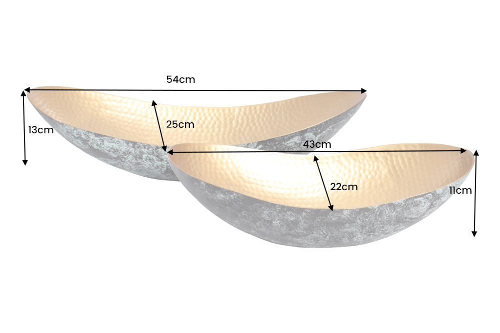 Dompel jezelf onder in de wereld van tijdloze elegantie met onze exclusieve set van 2 decoratieve schalen ABSTRACT ORIENT. Deze handgemaakte kunstwerken in goud en patina geven uw woonruimte een vleugje luxe en vertrouwen op hoogwaardig metaal in een gehamerd design. De decoratieve schalen ABSTRACT ORIENT belichamen de combinatie van kunst en functionaliteit. Hun esthetische aanwezigheid fascineert en geeft elke ruimte een onvergelijkbare flair. Elke kom is een meesterwerk van vakmanschap, zorgvuldig ontworpen om de zintuigen te prikkelen en de ruimte te verrijken.