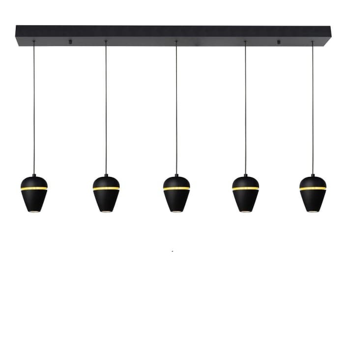 Deze gestroomlijnde zwarte hanglamp is de perfecte manier om elke ruimte op te fleuren. Dit 5-lichts systeem geeft je genoeg licht voor die donkere, late nacht uren. De lamp kan worden aangepast in sterkte met een externe dimmer. Maak van je kamer een sfeervolle ruimte met deze hanglamp.