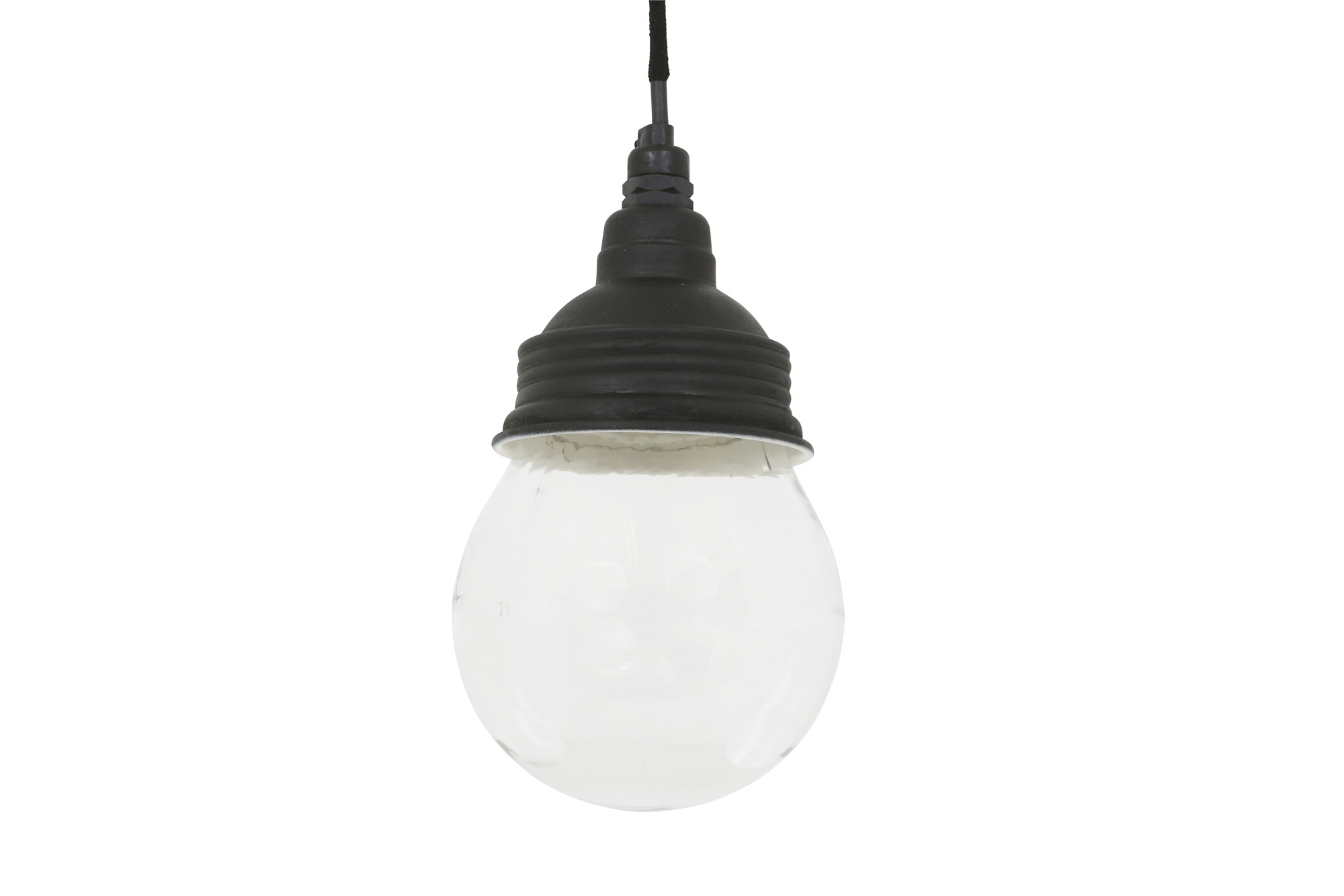 Een bijzondere hanglamp waarvan het ontwerp gebaseerd is op een lampfitting, in de kleur antiek zwart. De lamp is vervaardigd van messing en heeft een helder glazen bol met een diameter van 15 cm, de totale hoogte van de lamp -zonder snoer- is 25 cm.