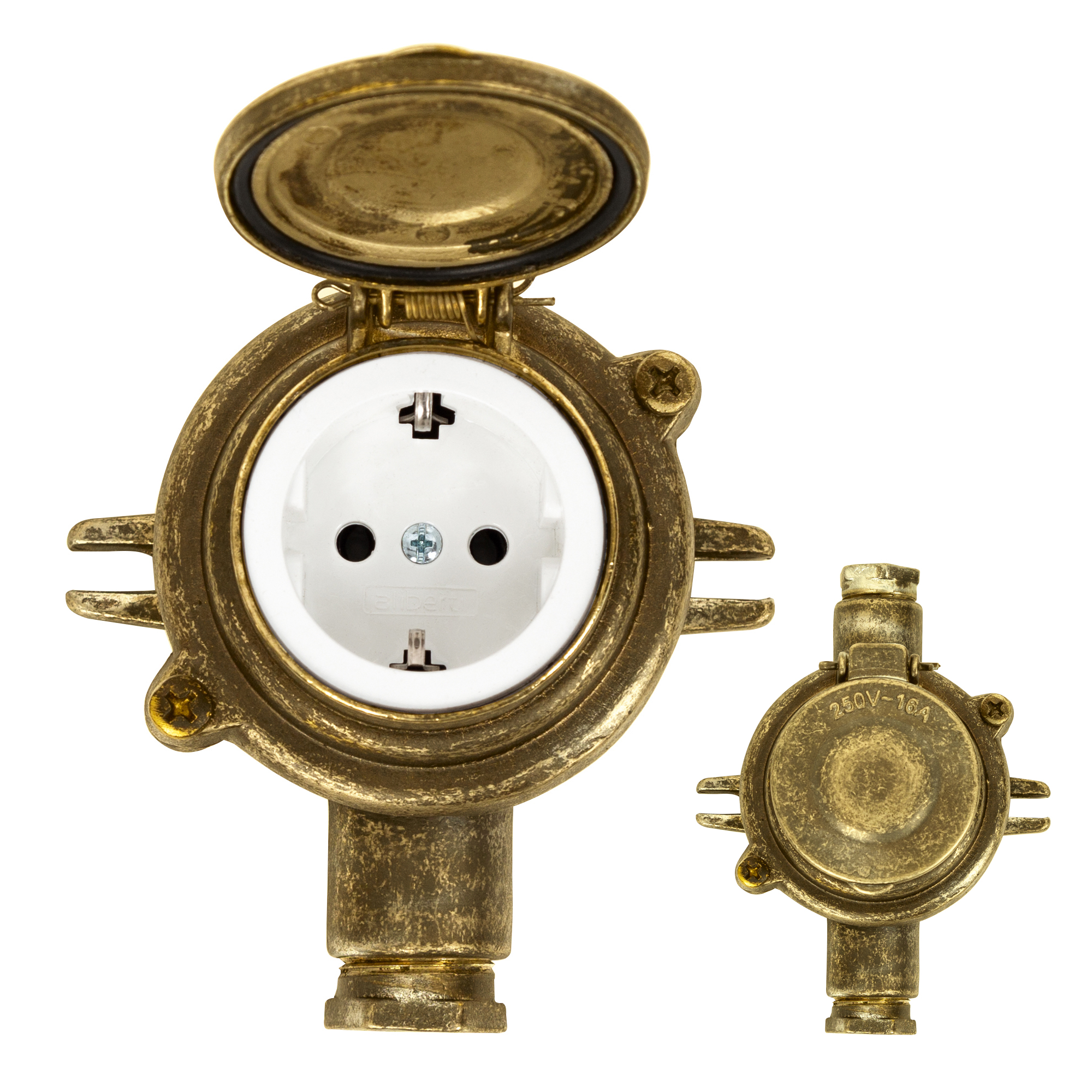 Traditioneel stopcontact geschikt voor buiten, stopcontact vervaardigd van messing met 2 in/uitgangen.