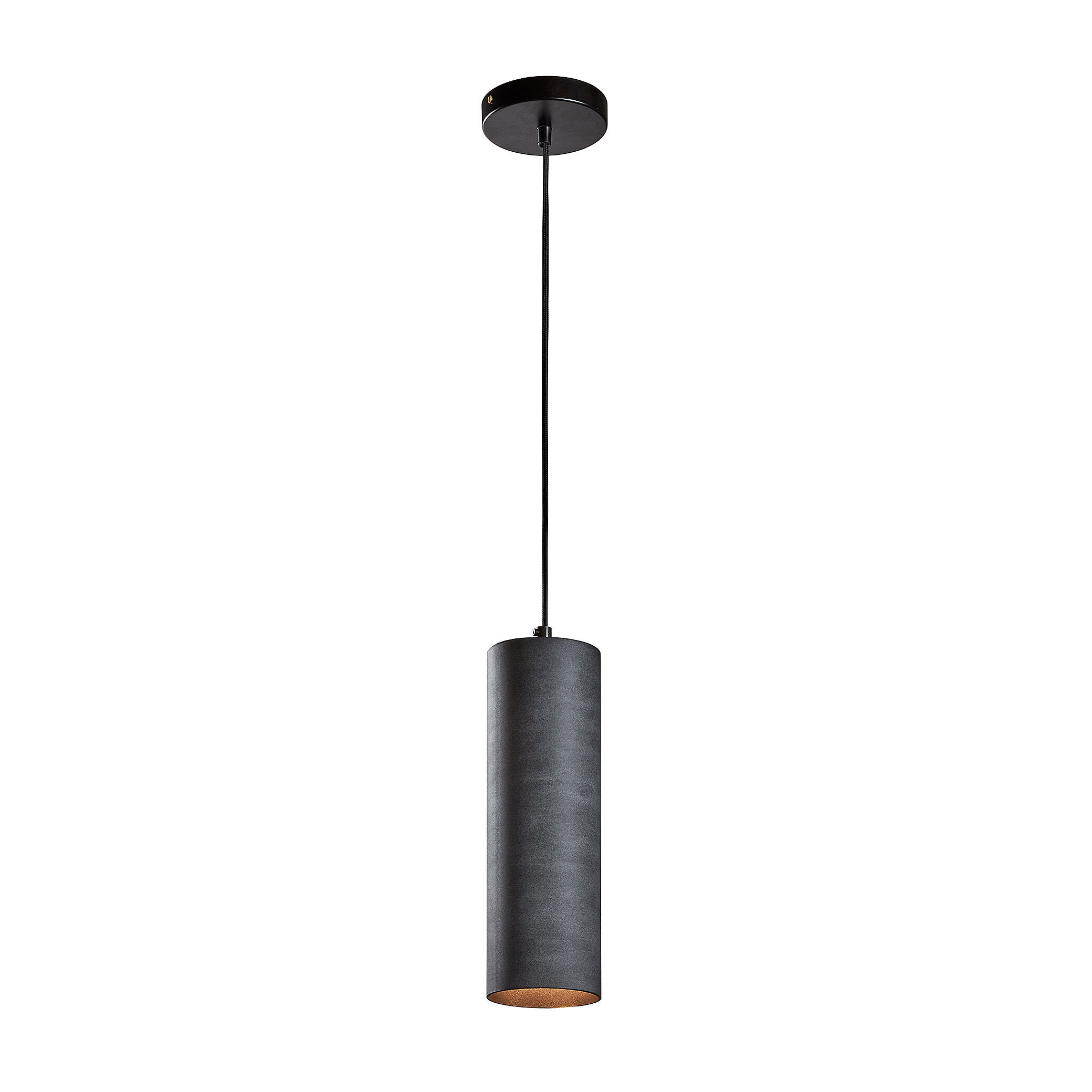 - Plafondlamp met stalen cilindrische kap en grijze afwerking.