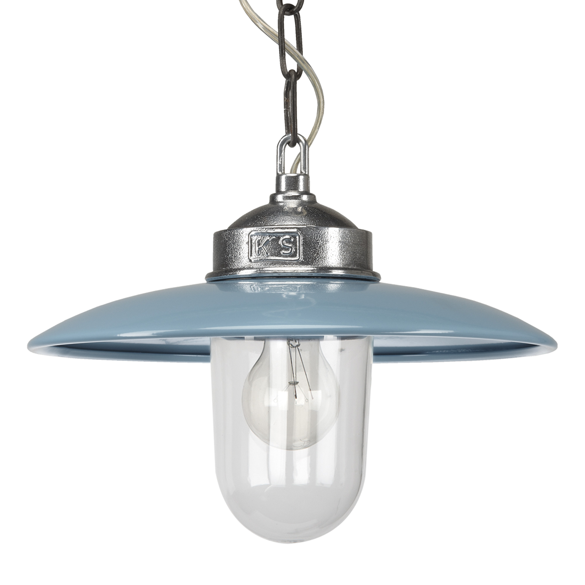 Een tijdloos vormgegeven hanglamp in de unieke retro & vintage kleur retro blauw. Deze hanglamp heeft een diameter van 31 cm is vervaardigd uit een aluminium kap en echt glazen stolp. Een hanglamp welk je mee terug in de tijd neemt en zich thuis voelt in velen soorten interieurs. De lamp wordt geleverd met een bijpassende aluminium plafondplaat.
