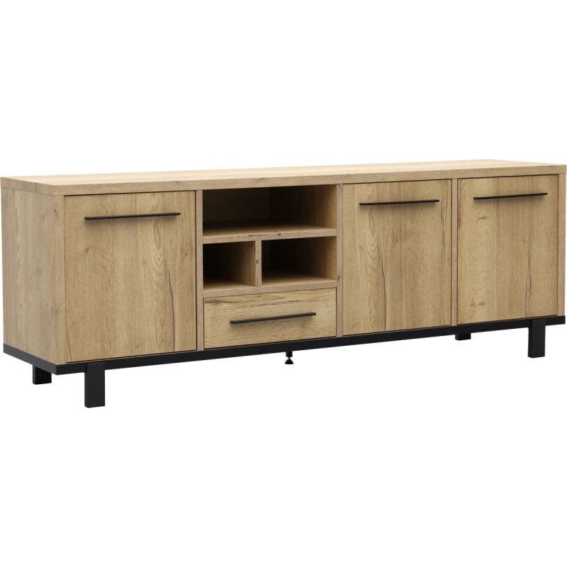 Lowboard Wilson: moderne lage kast bij Budget Home Store voorzien van een luxe softclosesysteem. Een lowboard is een lage dressoirkast. Een opbergkast die optisch minder ruimte inneemt dus. Lowboard Wilson heeft 1 lade, 3 open vakken en 6 vakken met vaste planken achter 3 deuren. Het design van de lage kast is strak en eigentijds. Lowboard Wilson heeft een zwart stalen frame (kastpootjes 11,5 cm hoog) en handgrepen en is afgewerkt met melamine in lichte houtlook. Melamine is een sterke kunststoflaag die oogt en voelt als massief hout. Een melamine kast biedt jou een aantal voordelen. Lowboard Wilson is hierdoor behoorlijk krasvast, werkt niet en is makkelijk schoon te maken met een vochtige doek. Het prettige van softclose is dat lades en deuren van de dressoirkast altijd rustig sluiten. Deze lage kast van Budget Home Store is een multifunctionele wandkast. Je kunt Wilson gebruiken als opbergkast, buffetkast of voorraadkast. Zoek op Wilson om meer meubels uit deze meubelserie van