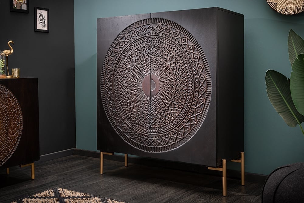 Bent u op zoek naar een bijzondere kast met veel opbergruimte? Dan is ons extravagante dressoir precies wat je zoekt. Een massief mangohouten lichaam in spannend zwart rust op een eenvoudig goudkleurig metalen frame. Het bijzondere aan het dressoir is echter zonder twijfel de weelderige ornamentversiering op de twee deuren.