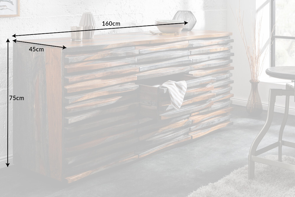 Massief dressoir RELIEF 160cm Sheeshamhout grijze rookafwerking met uitgewerkt front – 39746