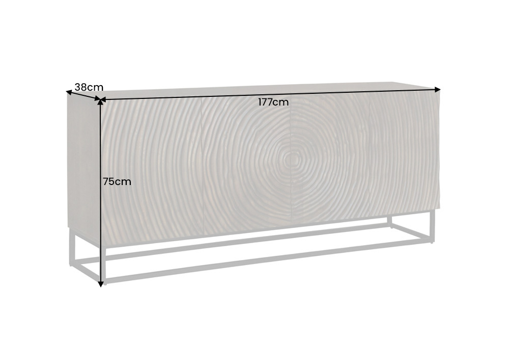 Houdt u van extravagant design en heeft u extra opbergruimte in huis nodig? Dan is ons design dressoir ZEN CIRCLES de ideale keuze! Het hoogtepunt van het massief houten dressoir is ongetwijfeld het artistieke 3D-snijwerk aan de voorkant. De vloeiende contouren lijken over het oppervlak te zweven en fascineren door hun buitengewone uitstraling. De gecentreerde cirkels doen denken aan boomringen, die voor een natuurlijke flair in uw huis zorgen. Dankzij het massieve ijzeren frame met zwarte poedercoating staat de kast stabiel onder de kast. Unieke houtnerven maken het dressoir echt uniek in je huis. Ervaar het moderne dressoir ZEN CIRCLES in jouw sfeer!