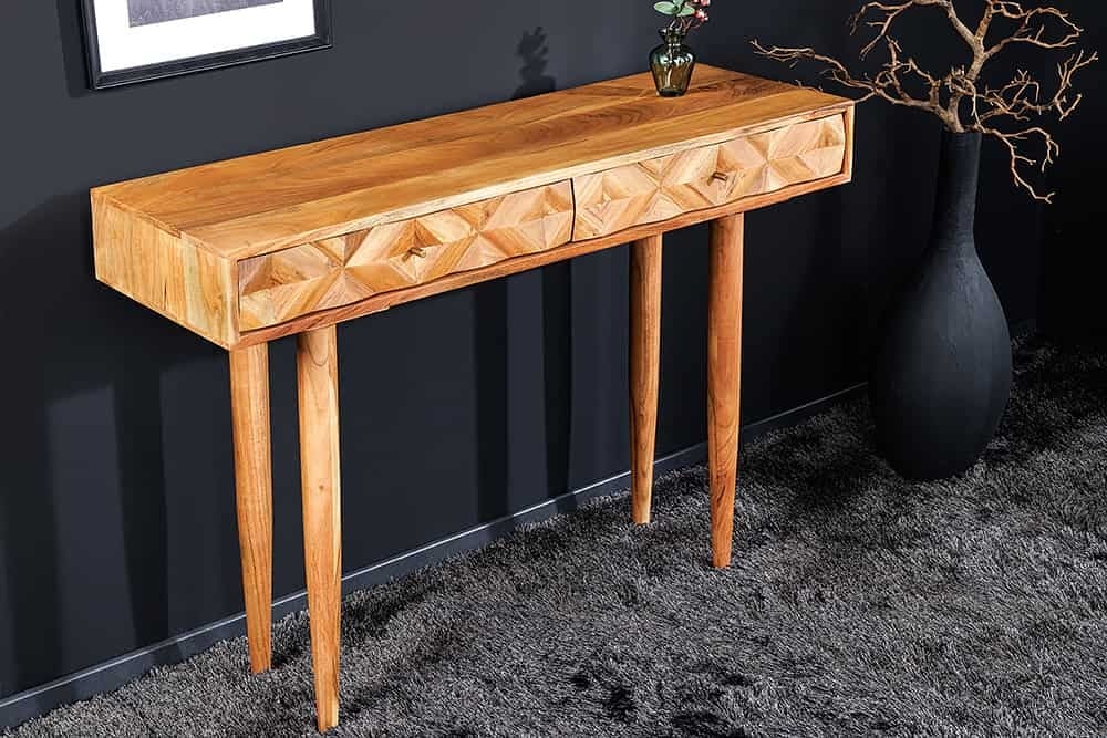 De ALPINE consoletafel is gemaakt van hoogwaardig acaciahout en is daardoor een meubelstuk voor het leven. Het is robuust, duurzaam en geeft elke kamer een bijzondere charme. De individuele nerf van het hout en het unieke 3D-front van de lades worden een blikvanger in je woonruimte. Voel een natuurlijke uitstraling in je sfeer met deze eyecatcher in retrostijl.