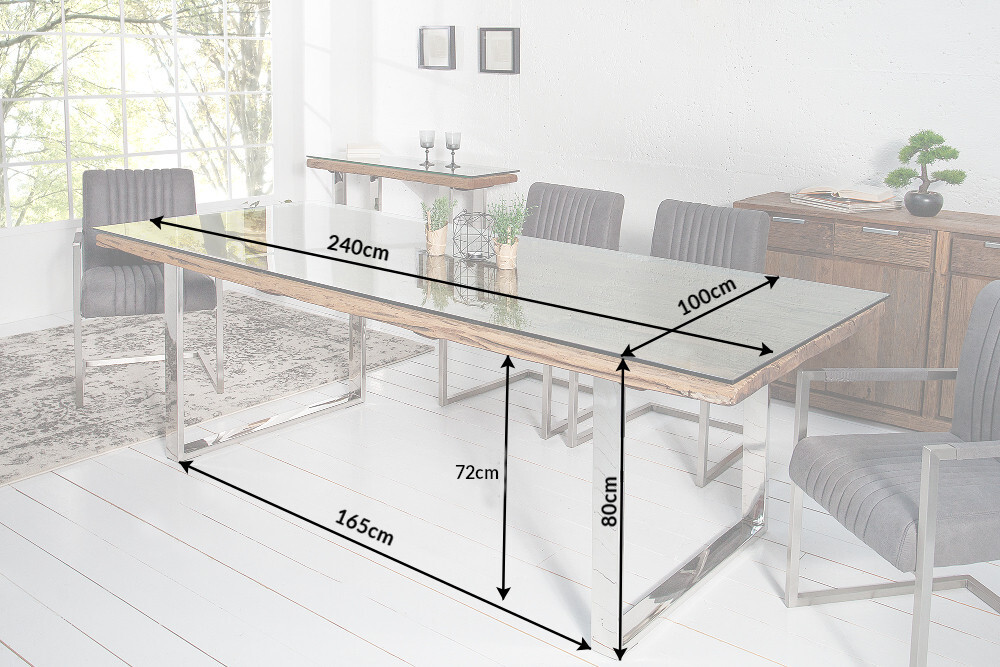 De massieve eettafel BARRACUDA is een geslaagde combinatie van natuurlijke en moderne elementen. Het rustieke tafelblad is gemaakt van oude houten planken en maakt indruk door zijn natuurlijke design. De door de natuur gecreëerde scheuren en groeven werden bewust verwerkt en achtergelaten. Dit maakt elke tafel uniek! Het tafelblad, gemaakt van antiek teakboothout, rust op een recht roestvrijstalen frame. Dit geeft de eettafel een veilige en stabiele stand en combineert modern design met natuurlijke elementen. De tafel oogt bijzonder indrukwekkend in combinatie met het bijbehorende glazen blad. Dit zorgt voor een vlak oppervlak zonder de unieke houten planken en hun prachtige nerven te bedekken. Elegant, functioneel en met een verbluffende uitstraling wordt deze tafel het middelpunt van uw huis.