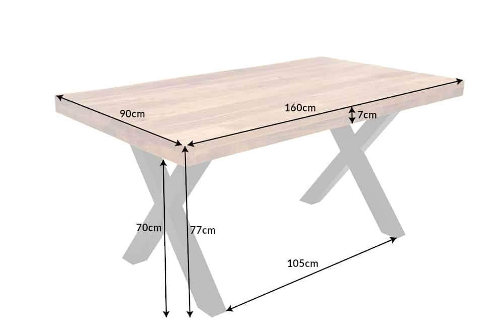De indrukwekkende X-poten van ijzer vormen een spannend contrast met het robuuste en toch elegante design van het bord. Dit geeft de tafel meer charme en onderstreept de moderne industriële look. Dankzij het tijdloze design combineer je de tafel gemakkelijk met een grote verscheidenheid aan stoelen, dressoirs en vitrinekasten. Een grote hanglamp past net zo goed als een kroonluchter en ook met de accessoires kun je je creativiteit de vrije loop laten. Dit maakt uw eethoek bijzonder individueel en de eettafel van mangohout verrijkt uw sfeer – ervaar het zelf!