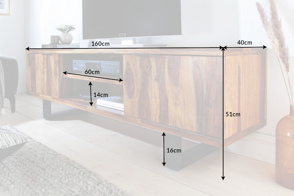 Ontdek dit tv-lowboard van hoogwaardig sheeshamhout! Het Indiase hout, afkomstig uit de palissanderfamilie, maakt indruk door zijn unieke kleur en nerf, die wordt onderstreept door de natuurlijke afwerking. Omdat de nerf van een boom net als zijn vingerafdruk is, is dit tv-meubel echt uniek. De hoogwaardige zwarte loperpoten geven het meubel een industriële uitstraling en ronden het totaalbeeld af.