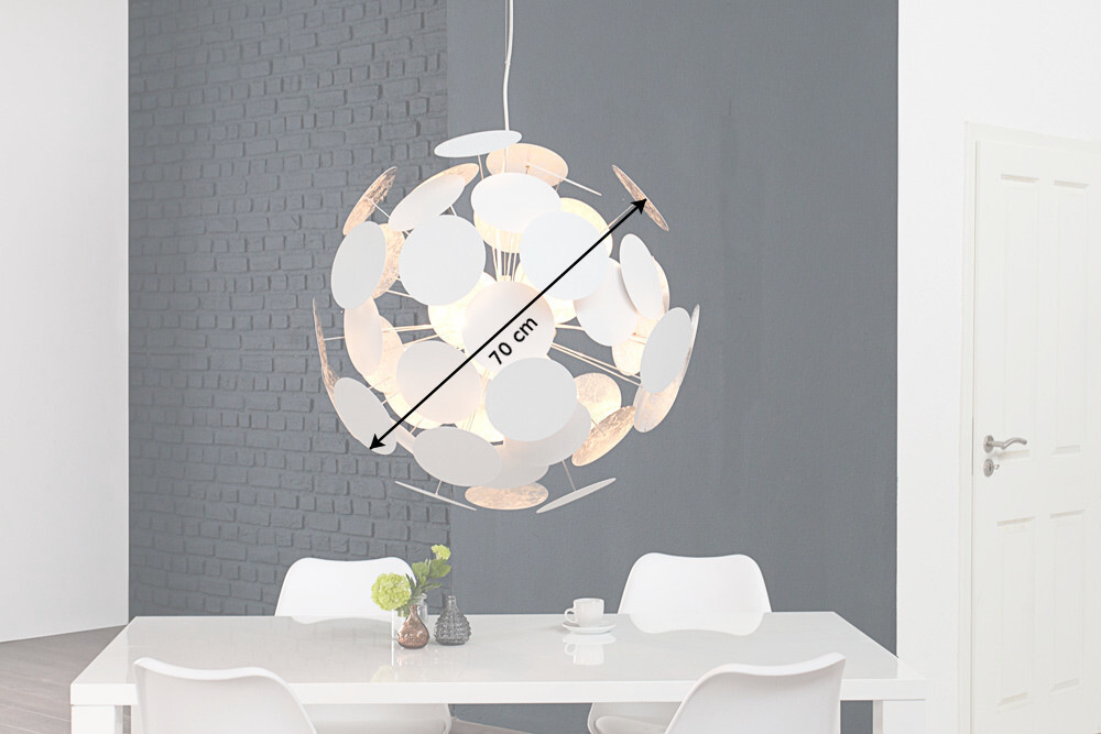 De witte en zilveren schijven die op twee niveaus aan staven zijn bevestigd, fungeren als diffuser. Aan de achterkant – uitgelijnd in de richting van de lichtbron – bevinden zich zilverachtig-metalen reflectoren die het licht verspreiden. Hierdoor ontstaan unieke lichteffecten die de ruimte op een aangename, verblindingsvrije manier verlichten. De ronde vorm en de plaatvormige structuur van de lampenkap geven de INFINITY HOME design hanglamp haar bijzondere uitstraling, waardoor ze zich elegant onderscheidt van alle andere hanglampen. Hun prachtige licht geeft de kamer een vleugje magie dat iedereen betovert. Ze zal zeker bewonderende blikken van uw bezoekers ontvangen. De lamp is gemaakt van wit gecoat metaal en heeft een diameter van 70 cm.