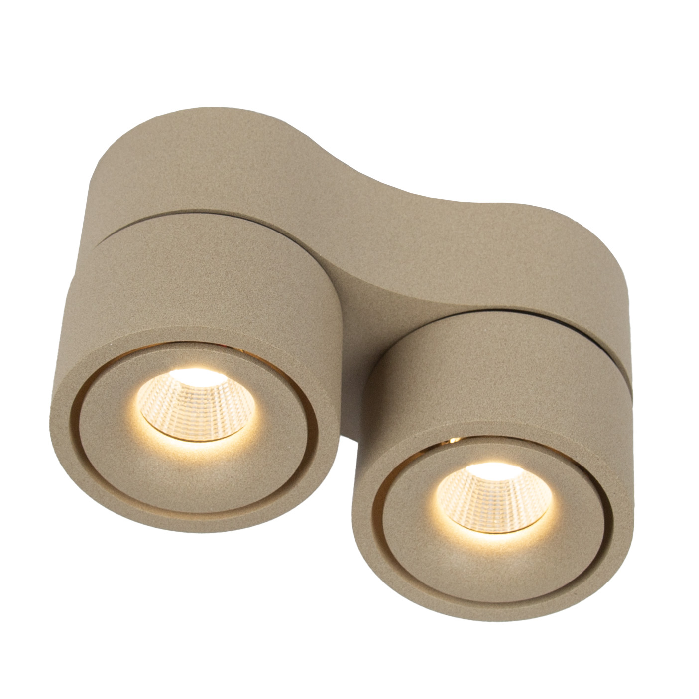 De Ole 2 champagne is een ronde verstelbare plafondlamp / spot (90 graden draaibaar en kantelbaar) met een hoogte van 9 centimeter en een doorsnee van Ø7,5 centimeter. Deze fraaie design spot kan op de wand en aan plafond gemonteerd worden.De Ole heeft een ingebouwde LED (2x 9,4 Watt) warm wit kleurige LED lichtbron (3000 Kelvin) met een totale lichtopbrengst dimbaar tussen de 45 en 919 Lumen per spot. Mocht je de Ole 2 aansluiten op een dimmer wordt de kleur van het licht warmer naarmate je de lamp zachter dimt. Tot wel 1900 Kelvin (goudkleurig). De Ole spot kan aangesloten worden op een dimmer. Je hoeft de spot enkel aan te sluiten.