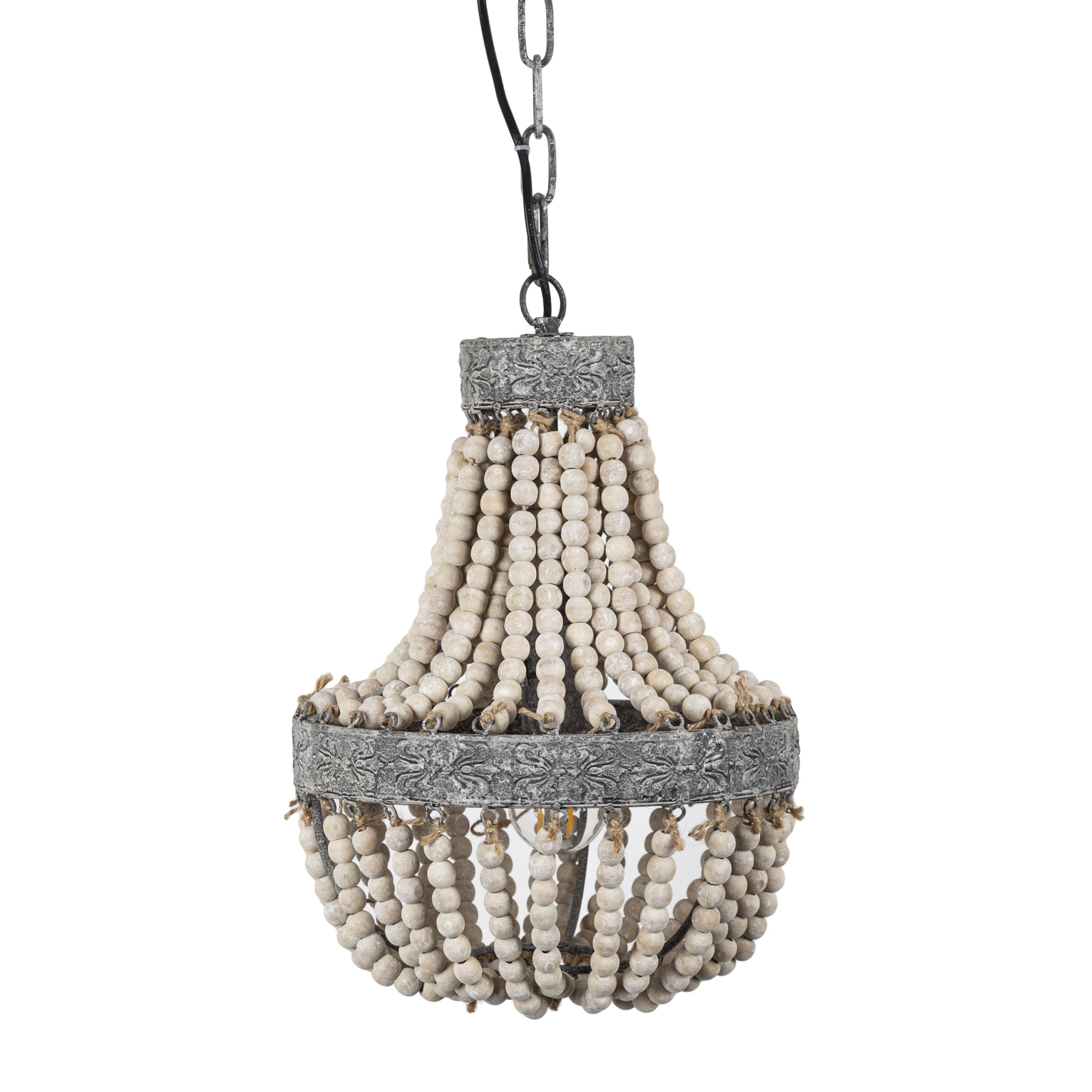 Breng sfeer in je interieur met deze stijlvolle sjieke kralen hanglamp van het merk Nostaluce. De lamp is voorzien van honderden met de hand gesneden houten kralen in de kleur oud grijs/wit. Het frame is gemaakt van metaal voor een stoer randje.Door de bijzondere afwerking en de ketting geeft het een stoerdere look aan deze kroonluchter dan de traditionele varianten. De kralen lamp van Nostaluce onderscheidt zich door een goede kralen bezetting wat een magnifiek effect geeft in zowel licht als voor het oog.De lamp is voorzien van een E27 fitting voor maximaal 40 Watt. Geschikt voor gloei-, spaar- en LED lampen. Je kan de Perle verkrijgen in twee varianten. De kleine variant heeft een kaphoogte van 40 cm en een diameter van 30,5 cm. Totale lengte van de lamp inclusief ketting is 148 cm. De grote zus Zion heeft een kaphoogte van circa 62 cm en een diameter van 51 cm.