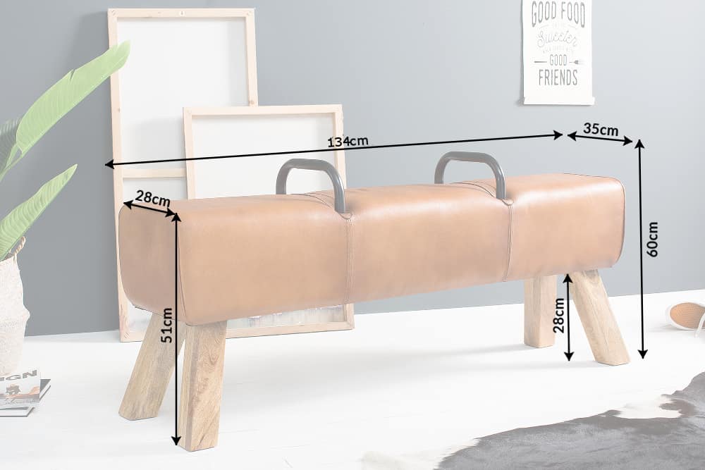 De bank met hoogwaardige bekleding van echt leer doet denken aan de gymnastiekschragen uit de oude schooltijd. De stijlvolle zwart metalen handgrepen vormen een mooi visueel contrast met de lichte lederen bekleding en de natuurlijk generfde massief houten poten van hoogwaardig mangohout. De gezellige vulling zorgt bovendien voor een comfortabel zitcomfort en maakt de kruk tot een praktische en stijlvolle zitmogelijkheid.