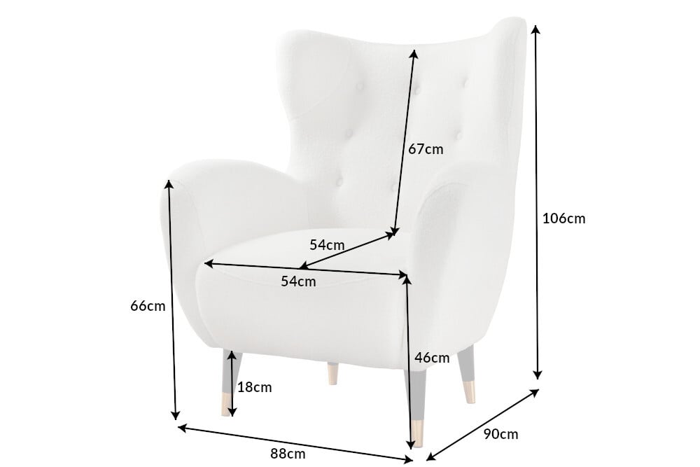 Onze oorfauteuil DON combineert tijdloos retro design met gezellige teddystof en is daardoor erg trendy. De gelakte houten poten met gouden applicaties vormen een harmonieus contrast met de gezellige pluche bekleding in elegant wit. Deze zachte teddystof van hoogwaardig bouclé zorgt voor gezellige uren en een aangenaam gevoel. Dankzij de ingebouwde veerkernvulling in de zitting zorgt het zitmeubel voor het hoogste zitcomfort.