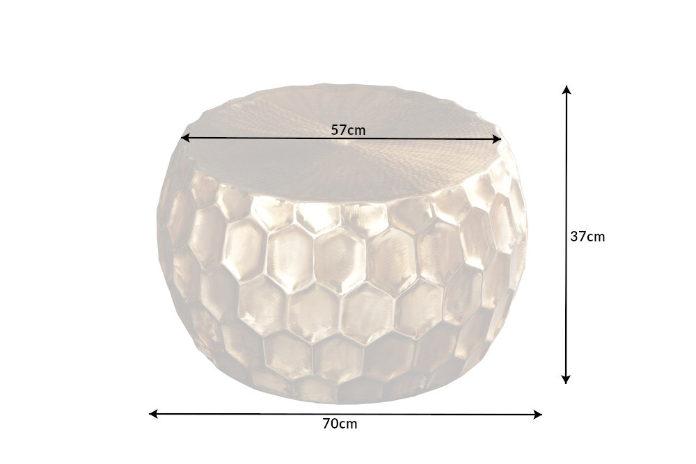 De ORGANIC ORIENT salontafel overtuigt door zijn elegante uitstraling en brengt glamoureuze flair in uw woonkamer. Een bijzonder hoogtepunt van de ronde bijzettafel in goud is het driedimensionale honingraatdesign aan de buitenkant van de tafel en de gehamerde look op het tafelblad. Geef je huis een oosterse uitstraling met dit handgemaakte meubelstuk!
