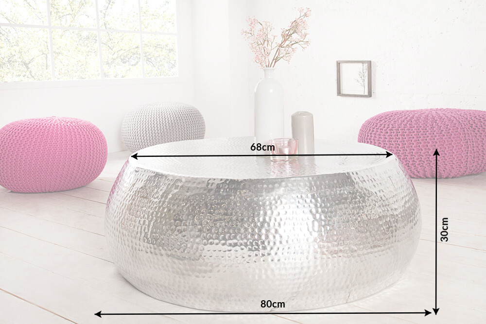 Ronde salontafel ORIENT 80cm zilver metaal aluminium gehamerd ontwerp handgemaakt – 38396
