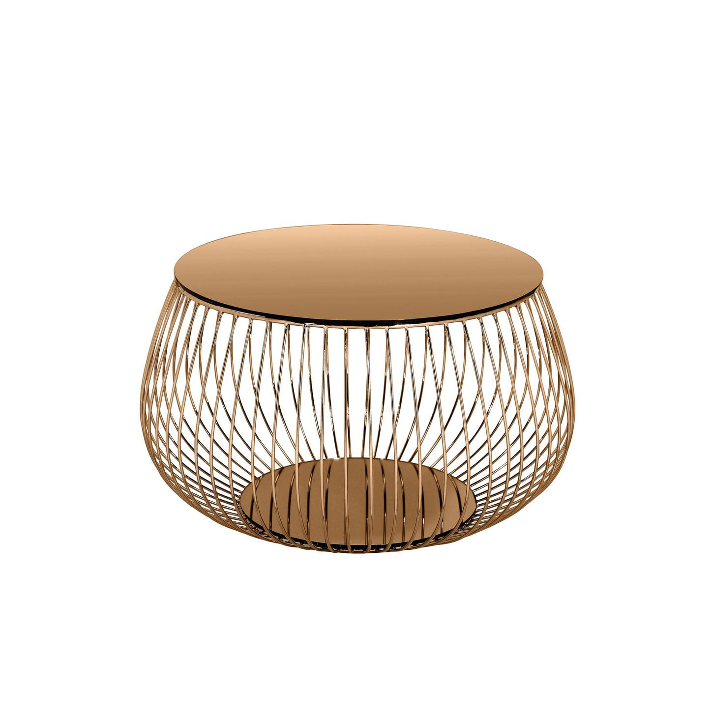 Deze salontafel is een echte eyecatcher voor in je interieur! Het frame is vervaardigd uit een rosékleurige metaaldraad, het blad is vervaardigd uit een spiegelend 6mm dikke kristallen glasplaat. Het tafelblad heeft een doorsnede van 60 centimeter.