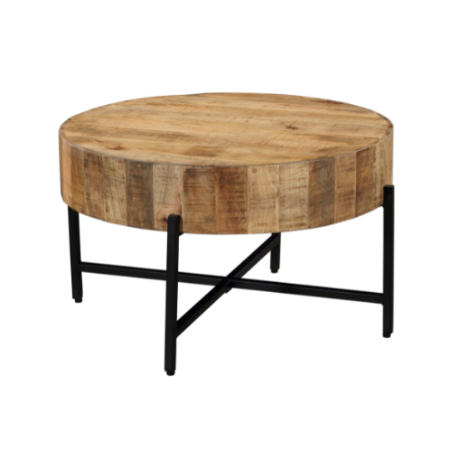 De ronde salontafel Cooper is uitgevoerd in het mangohout. Het hout is afgewerkt met een matte lak en het metalen frame met een zwarte lak.