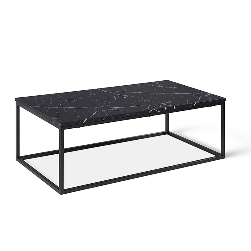 Deze betaalbare salontafel kan door zijn strakke design in elke woonkamer geplaatst worden. De tafel heeft een zwart metalen frame en staat daardoor stabiel op de grond. Het blad is gemaakt van een stevige meubelplaat met een marmeren afwerking. De tafel is verkrijgbaar in het wit, zwart, eik en beton.